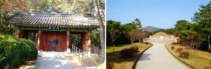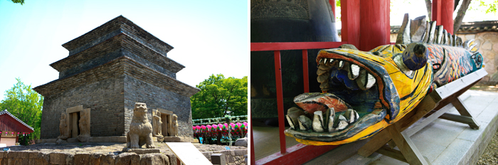 三国統一(676年)を成し遂げた新羅30代の文武大王(在位 661∼681)の水中陵(長さ約20メートルの岩の島)で、慶州市内から約36キロ離れたところにあります。「死んだら火葬して東海に埋めよ、そうしたら護国龍となって新羅を保護しよう」という王の遺言に従い仏教式の葬儀方法で火葬し、遺骨をここに埋めたと伝えられています。死んでも国を護ろうという王の護国精神が染み込んだ場所です。