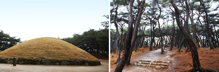 新羅時代初の女王で、27代王でもある善徳女王(在位 632∼647)のお墓です。王陵は高さ6.8メートル、直系23.6メートルの丸く土を積み上げてつくった円形の墓で、他の王陵に比べ小規模です。特別な装飾はありませんが、王陵を囲む森の中の背の高い松の木々が全て墓の方を向いており、こぢんまりとした印象を受けます。