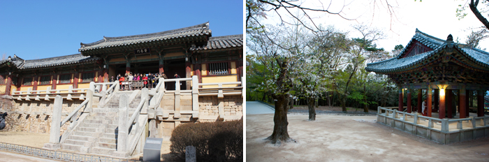 7世紀に初めて建てられましたが、朝鮮時代(1392~1910年)に数度に渡り再建された寺で、非常に規模が大きく雄壮です。境内にはしっかりした構造と厳かな空間構成が垣間見られる朝鮮後期の代表的な仏殿、「大寂光殿」を含め、多くの建物が残っており、3千の仏壇が置かれている「三千仏殿」が、大変印象的です。