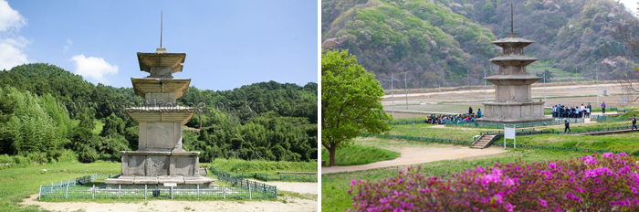 仏の力で国を護ろうとつくられた寺院の一つで、現在は寺跡とともに、東西に向かい合って立っている二つの三層石塔が残っています。三国を統一(676年)した文武王(在位 661∼681)が建築を始め、彼の息子の神文王(681~692年)が完成させました。死んでも龍となって国を護るという父(文武王)がこの寺に出入りできるよう息子の神文王が金堂(本尊を置く寺の中心的な建物)の下を変わった構造でつくりました。